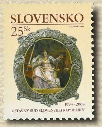 Slovenská pošta, a. s., vydala 3. 4. 2008 poštovú známku "Ústavný súd Slovenskej republiky 1993 - 2008" v nominálnej hodnote 25 Sk. Na známke je stvárnený motív rímskej bohyne Justície, ktorá je spolu so svojimi atribútmi (mečom a váhami) umiestnená v oválnom ozdobnom ráme. Poštovú známku rozmerov 26,5 x 33,9 mm vrátane perforácie (na výšku) vytlačila viacfarebnou ofsetovou technikou tlačiareň Poštovní tiskárna cenin Praha, a. s., na tlačových listoch s 50 známkami. Autorom výtvarného návrhu známky je Mgr. art. Štefan Kubovič. Súčasne s poštovou známkou bola vydaná obálka prvého dňa vydania s domicilom Košice a s pečiatkou FDC s dátumom 3.4.2008. Na FDC je zobrazená budova Ústavného súdu v Košiciach v kompozícii s postavou Archanjela Michaela s mečom a váhami. FDC pečiatka zobrazuje bohyňu Justíciu podľa motívu rímskej mince follis z 3. - 4. storočia. FDC vytlačila tlačiareň TAB, s.r.o., Bratislava v náklade 3 200 ks. Technika tlače FDC: Intaglio – líniová tlač z hĺbky plochej platne. Autorom výtvarného návrhu FDC je Mgr. art. Štefan Kubovič. Známka platila vo vnútroštátnom i medzinárodnom poštovom styku od 3. 4. 2008 až do 31. 12. 2008. |