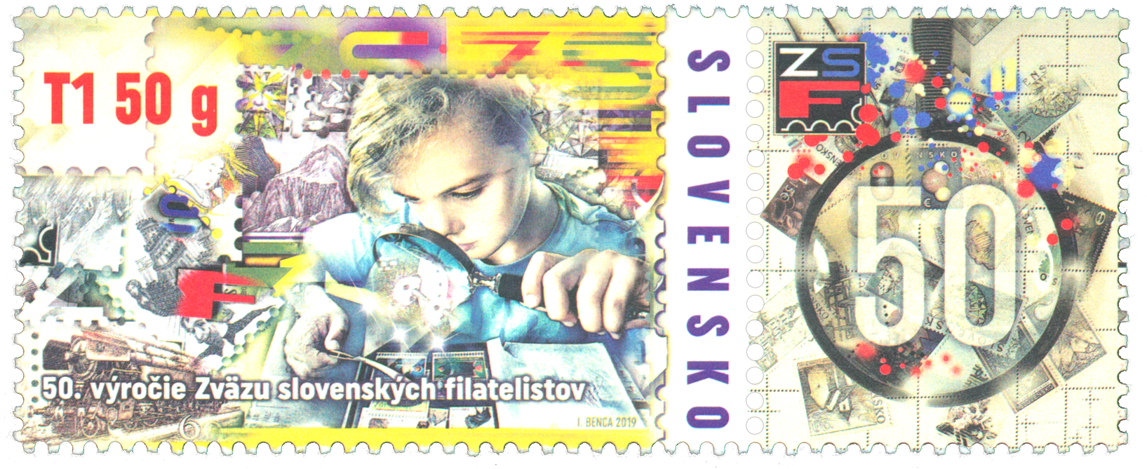 Ministerstvo dopravy a výstavby SR schválilo platnosť poštovej známky „50. výročie Zväzu slovenských filatelistov“ s označením nominálnej hodnoty T1 50g. Označenie zodpovedá cene, ktorá sa zhoduje s výškou poštovej sadzby za list 1. triedy do hmotnosti 50 g vo vnútroštátnom styku, položka L.1.01 Tarify SP, a. s. Poštová známka platí vo vnútroštátnom a medzinárodnom poštovom styku od 17. 5. 2019 až do ukončenia platnosti. Poštovú známku rozmerov 44,1 x 26,5 mm vrátane perforácie (na šírku) vytlačila technikou viacfarebného ofsetu spoločnosť Tiskárna Hradištko, s. r. o., na tlačových listoch s 30 známkami a 30 kupónmi. Motívom poštovej známky je koláž zo slovenských filatelistických reálií spolu s mladým filatelistom s lupou a albumom. Súčasne s poštovou známkou je vydaná obálka prvého dňa s pečiatkou FDC a domicilom Sliač. Motívom prítlače na FDC je koláž, ktorej hlavným námetom je logo ZSF a historické poštové pečiatky. Motívom FDC pečiatky je štylizovaná kresba obálky. FDC vytlačila technikou oceľotlače z plochej platne spoločnosť Poštovní tiskárna cenin Praha, a. s. Autorom výtvarných návrhov emisie je doc. akad. mal. Igor Benca. Autorom rytiny FDC je Mgr. art. Jozef Česla. |