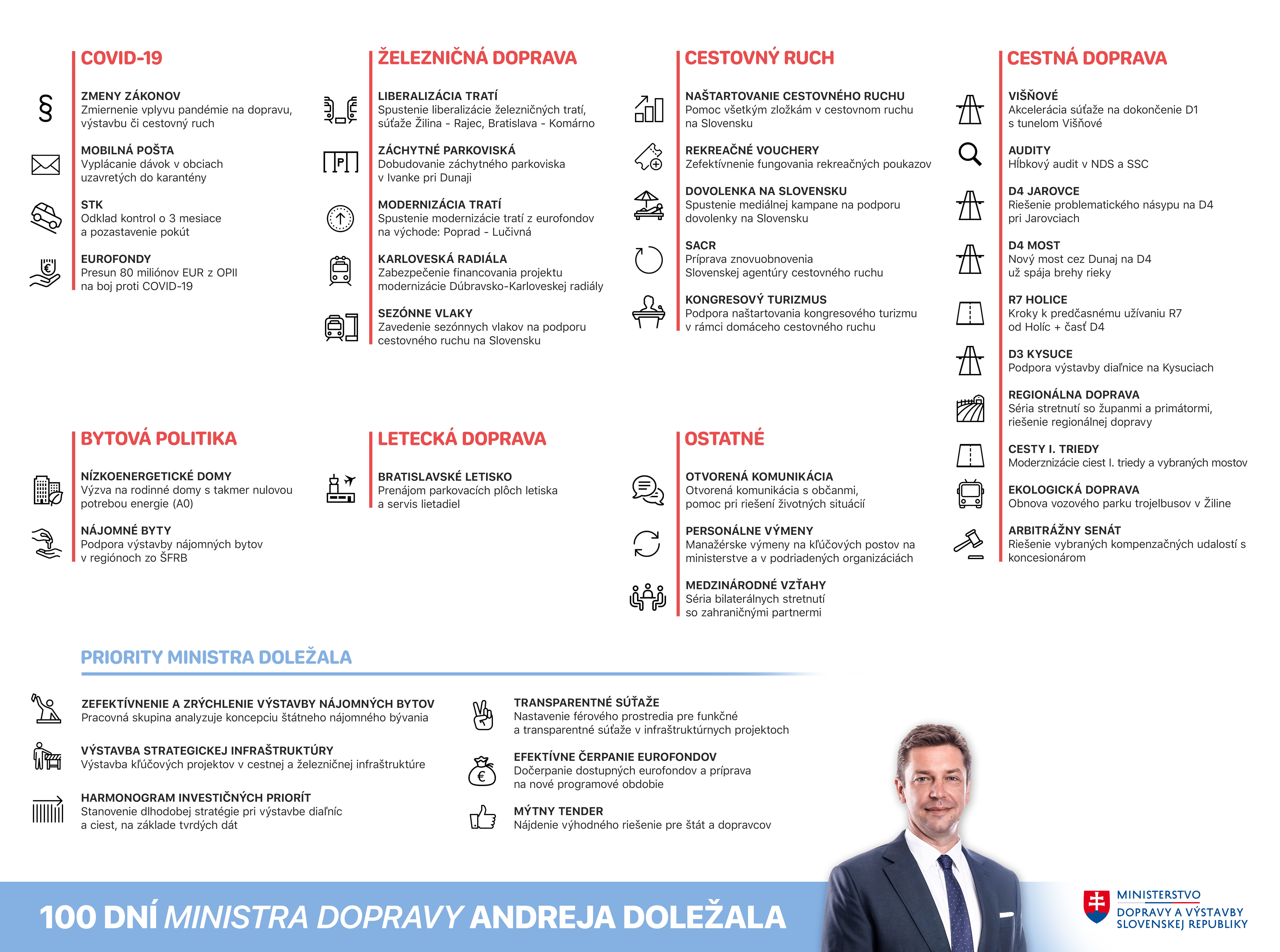 Minister Andrej Doležal sa za prvých 100 dní svojho pôsobenia vo vláde zaoberal predovšetkým riešením následkov koronakrízy. Zároveň sa oboznámil s problematikou rezortu, začal cesty do regiónov Slovenska a intenzívne sa venuje realizácii programových priorít vlády.