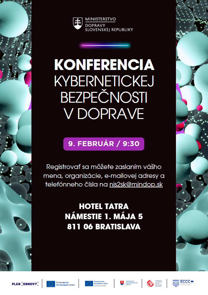 februári bude Konferencia kybernetickej bezpečnosti v doprave. Jej súčasťou budú aj prezentácie a diskusné bloky vedené zástupcami jednotlivých podsektorov. Záver konferencie bude patriť spoločnej diskusii, v rámci ktorej bude priestor na otázky, podnety, výmenu skúseností, zdieľanie dobrej praxe a prehĺbenie prípadnej spolupráce medzi zúčastnenými subjektmi. Kapacita konferencie je 80 účastníkov v auditóriu.
