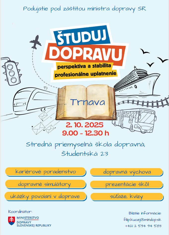Zvýšiť záujem žiakov o štúdium na stredných odborných školách a vysokých školách v oblasti dopravy a poštových služieb je cieľom spoločného podujatia Ministerstva dopravy SR, Strednej priemyselnej školy dopravnej v Trnave, ďalších rezortných stredných odborných škôl, Žilinskej univerzity, rezortných zamestnávateľov a vybranýchregionálnych partnerov s názvom ŠTUDUJ DOPRAVU, ktoré sa uskutoční  2. 10. 2025 v Trnave  v priestoroch Strednej priemyselnej školy dopravnej, Študentská 23,  od 9.00 do 12.30 h.