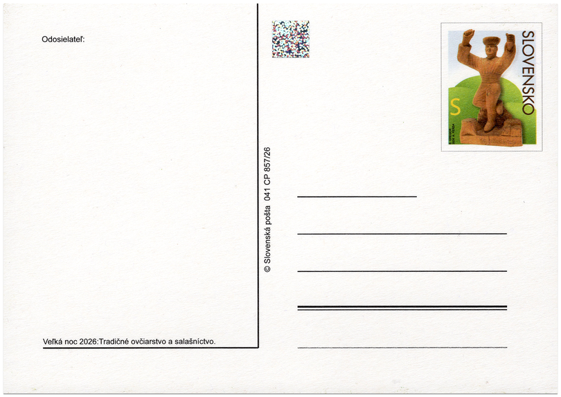 Ministerstvo dopravy Slovenskej republiky schválilo platnosť poštovej známky „Veľká noc 2026: Tradičné ovčiarstvo a salašníctvo“ s označením nominálnej hodnoty S, ktoré zodpovedá sadzbe za list 2. triedy do hmotnosti 50 g vo vnútroštátnom styku, položka L. 2. 01 Tarify SP, a.s. Poštová známka platí vo vnútroštátnom a medzinárodnom poštovom styku od 3. 3. 2026 až do ukončenia jej platnosti. Poštová známka rozmerov 26,5 mm x 33,9 mm, vrátane perforácie, vychádza vo forme upraveného tlačového listu s 50 známkami a technikou ofsetu ju vytlačila spoločnosť Tiskárna Hradištko, s. r. o.